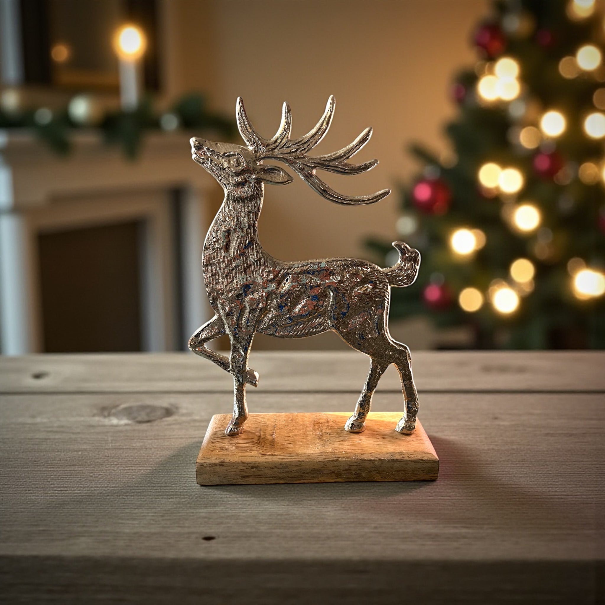 Lovely free standing silver reindeer ornaments mounted on a wooden block, available in 3 sizes these make a lovely festive addition to your Home, either individually or as a set.