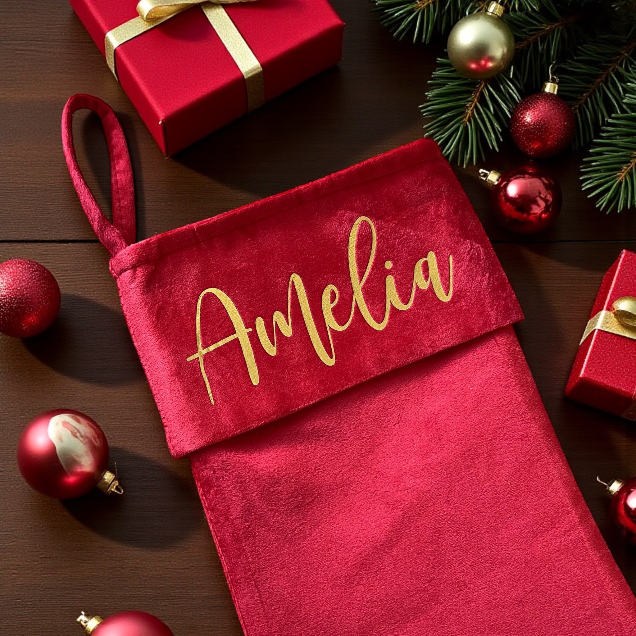 Made from soft red velvet fabric they have a traditional and luxurious feel, and are fully lined in red poly cotton. You will personalise the stocking with the name of your choice which we will print in your choice of colour on the top of the stocking.