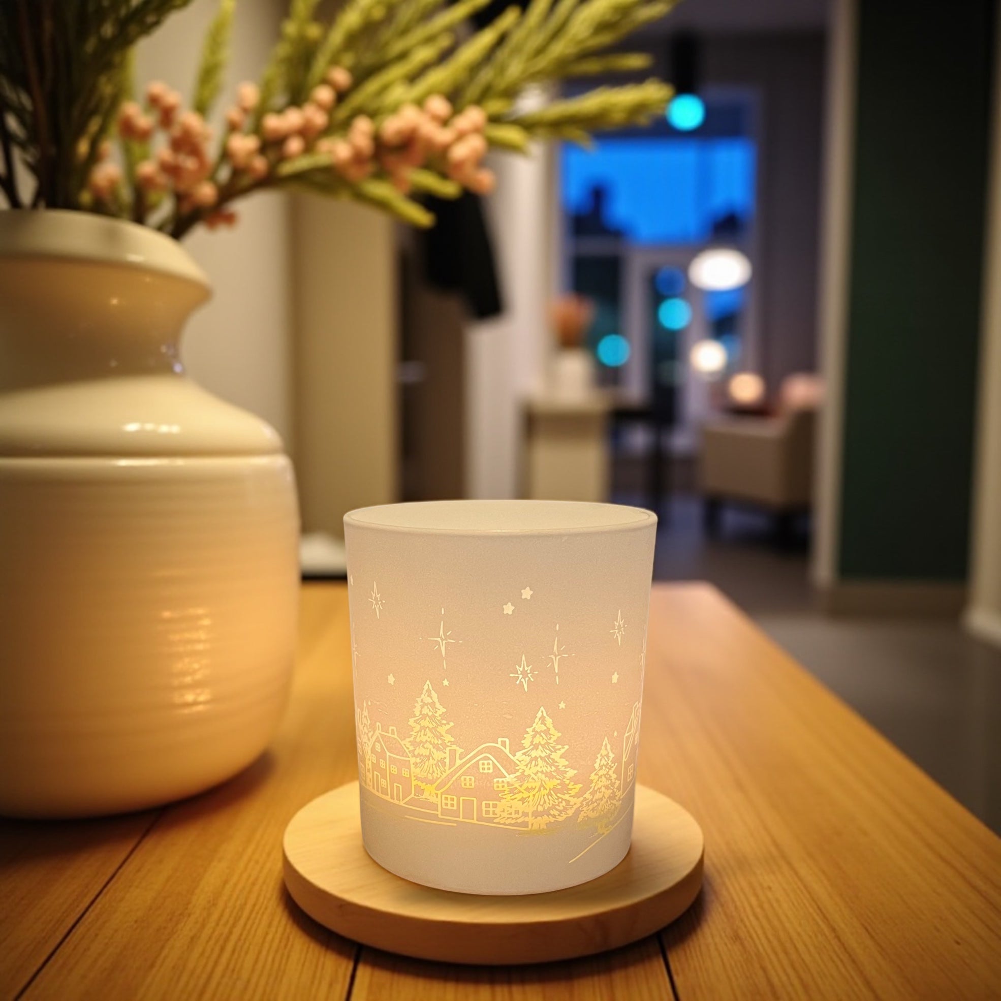 A beautiful single wick candle in a matt white glass container with a laser engraved winter scene. The design features a hand-drawn village with starry night sky. As the candle burns the light glows through the design making a beautiful seasonal feature.